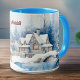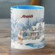 This charming design features a cute reindeer in a blue-grey scarf in front of a wintry wonderland, with decorated snowy Christmas trees, a cozy festive house, and a pond. Your or your recipient' name appears in a maroon dark red) in the middle of the cup (opposite the handle vs. on either side).Make sure to type the name you want in the Personalize section. This design is shown on a combination mug with sky blue - almost a turquoise - handles and cup inside, but many other options are available, both plain and fancy.