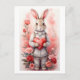 This charming Easter postcard features a vintage-inspired bunny holding a heart, surrounded by rose blossoms and soft spring hues. On the back, a warm seasonal message and a stylish “Happy Easter” greeting help you share heartfelt wishes in a simple, elegant way. The message can be left as-is or replaced with your own. Ideal for mailing, gifting, or even displaying as seasonal decor.