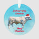 Ce taureau Charolais dans un chapeau de Père Noël est représenté sur un arrière - plan bleu neigeux.