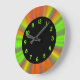 Chartreuse numbers on a black circle. You can replace the digital fractal art image with a photo and create your own gift wall clock. Sample image that forms circular border is fractal art with orange, yellow and lime green streaks.