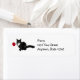 Un chat tuxedo noir et blanc tient une seule rose rouge. Utilisez ces étiquettes d'adresse de retour sucrées sur vos cartes de Saint-Valentin.