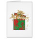 Un chat tabby orange sort d'une boîte cadeau de Noël recouverte d'un papier rayé kitty rouge et vert, d'un ruban or et d'un arc. Art de Margaret Loftin Whiting.