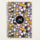 Une illustration amusante du visage des chats bordés d'un contour noir audacieux. Il y a des chattes grises, noires, orange et blanches avec des oreilles pointues en tee - shirt serrées les unes à côté des autres dans un collage sans couture, motif répétitif qui a un cercle noir bordé de rose pâle au milieu sur lequel un modèle blanc pour votre monogramme ou vos initiales apparaissent. Ce graphisme humoristique de style aquarelle est le cadeau idéal pour les amoureux de les chats.