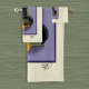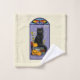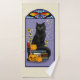 Un chat noir assis sur un tas de livres à la bougie rouge, des citrouilles, des susans aux yeux noirs et un papillon en verre taché sur un fond de violet et de jaune clair.
