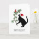 Un chat noir regarde un cardinal rouge dans le sapin de Noël sur cette carte de vacances amusante.