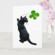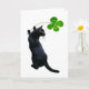 Un chat noir tient un trèfle vert à quatre feuilles. Souhaitez bonne chance avec cette carte de chat irlandais le jour de la Saint-Patrick.