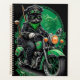 Un ami en fureur derrière les guidons d'une moto verte brillante, portant une tenue verte de la Saint Patrick qui fait tourner la tête. Le chat est habillé dans un ensemble festif, avec une cravate arc-en-ciel verte et un chapeau haut assorti qui se trouve doucement au-dessus de la tête. L'ensemble présente des motifs complexes de shamrocks et de leprechauns, ce qui indique clairement que ce chat est prêt à célébrer la Saint Patrick avec style.