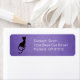 Étiquette chatte violet élégant avec une belle illustration d'un chatte noir mauve gracieux avec des yeux brillants sur un arrière - plan gris texturé violet foncé.