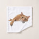 Portrait d'un tabby orange chat domestique shorthair posé sur un arrière - plan blanc avec patte drapé sur une table