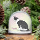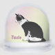 Personnalisez cette boule à neige avec le nom d'un animal de compagnie, ou n'importe quel texte et vous pouvez changer l'arrière-plan de ce design présentant une illustration originale d'un chat bicolore noir et blanc "Tuxedo". Cette œuvre d'art originale d'un chat tuxedo a été inspirée par les propres chats de l'artiste.