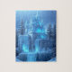 Puzzle d'un château magique entièrement de glace. Une cascade gelée descend des fondations du donjon pour devenir glaces à son extrémité. Des pins entourent le château tandis que le Soleil se réfraction à travers la glace créant de belles lumières bleues qui semblent venir du coeur du donjon... peut-être les rêves gelés essayant de se libérer. L'image a été générée avec Leonardo.ai et modifiée par moi.