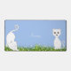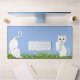 Chat blanc mignon animes et fleurs sur bleu clair.