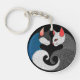 Représentation artistique de deux chats face à face, entrelacée dans un design circulaire. Les chats sont dépeints dans des couleurs contrastées noir et blanc, avec des accents rouges vifs sur leurs oreilles et leurs yeux. L'arrière - plan présente un dégradé de bleu et de noir, améliorant le contraste visuel global et la symétrie de la composition.