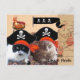 Les chats pirates sont assis sur un vieux tapis turc avec barbecue, cartes au trésor des pirates et bannière noire de pirate avec crânes et os croisés sur fond rose. Photo et conception graphique numérique par Bulgan Lumini (c)
