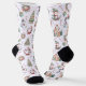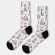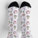 Ces chaussettes de Noël seraient un adorable ajout à votre garde-robe pour la saison festive. Le motif présente elfes, Santas, arbres de Noël, ornements, cadeaux, sucres de canne et maisons en pain d'épice sur un arrière - plan blanc.