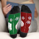 Chaussettes de Noël au design blanc rouge et vert. Les chaussettes sont ornées d'oeuvres d'art d'arbres de Noël, de bas, d'ornements et de cadeaux. L'art est entouré de flocons de neige, avec de la place pour les noms ou un message personnalisé sur chaque chaussette! Message MineByDesign pour de l'aide sur ce design ou tout autre design que vous envisagez!