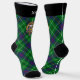 Clan Duncan crest badge surrounded by a strap and buckle over tartan background. Custom top stripe color. Custom text on each sock.