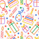 This design bursts with celebration. It’s a lively, all-over pattern filled with classic birthday icons drawn in bold, colorful outlines. Scattered across the layout are: