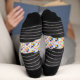 "Colorful patterned socks with geometric designs in blue, orange, and white. Black accents are visible at the toes, heels, and cuffs. Displayed from top and side views."