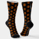 Cette superbe paire de chaussettes d'équipage à motifs présente un ovale orange avec six corbeaux. Chaque corbeau a des yeux jaunes avec des élèves noirs et des ailes étirées. Les corbeaux volent vers l'autre formant une forme ovale. L'arrière - plan est noir.