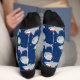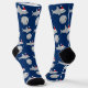 Chaussettes de Noël d'animaux amusantes avec des requins mignons et souriants dans des chapeaux de Santa qui portent des boules disco dans un motif répétitif sur un arrière - plan bleu foncé. Disco Ball Shark Santa Hat Chaussettes de Noël Conception | ©Melissa Patton - Artiste/Illustrateur
