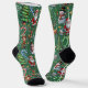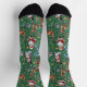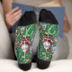 Christmas-themed pattern featuring Santa Claus, reindeer, snowmen, elves, Christmas trees, candy canes, and snowflakes on a green background