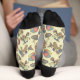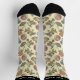 Icône de Jouets en bois définie dans la palette de couleurs vintage. Train, vélo, tourelle, tambour, aérodrome et ballon de plage. Motif sans couture. Couleur arrière - plan personnalisée. Couleur de bande supérieure personnalisée. Texte personnalisé sur chaque chaussette.