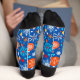 Arrière - plan bleu vif rempli de divers éléments décoratifs associés aux célébrations hivernales et festives. Les ornements colorés, principalement dans les tons orange, bleu et rouge, sont exposés avec des motifs complexes de flocon de neige et des rayures. De plus, de multiples flocons de différentes formes et tailles sont disséminés dans l'ensemble, ainsi que de petits cercles aux couleurs contrastées, ajoutant à l'ambiance festive. L'ensemble est ludique et gai, évoquant un esprit de vacances.
