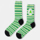 Celebrate St. Patrick's Day with striped socks. This design features various shades of green on a white background. There's a white badge, on the outside calf, of the each sock. The text reads, 'HAPPY ST. PATRICKS DAY” and has a neon green shamrock, in the center.