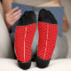Ces chaussettes sont fantaisistes et amusantes. Parfait pour la Saint-Valentin ou toute autre journée. Le dessus est noir avec un coeur rouge, qui dit "Be My Valentine". Ensuite, il y a un motif blanc. Dans la partie médiane, il est rose avec des pois blancs et, en bas, rouge avec des points noirs.