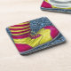 Photo de fond d'une chaussure de clown rouge et jaune et de chaussettes rayées imprimées sur un ensemble de dessous de verre.