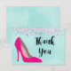 Un carte de remerciements avec une chaussure en stiletto rose chaud. Des confettis roses parsemés le long du sommet. Placez-vous sur un arrière - plan d'aquarelle vert menthe. Chic et glamour.