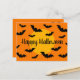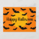 Chauves-souris orange et noires Bonne carte postale Halloween. motif de chauve-souris éffrayant et conception pleine lune avec typographie de script de brosse. Impression de carte amusante pour la fête costumée pour enfants, les célébrations à la maison, la fête de bureau, tour ou traitement, nouvelle adresse, déménagement, déménagement et plus encore. Changez la quantité pour obtenir le prix de remise en vrac bon marché.