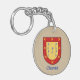Hispanic surname Chaves historical family shield Keychain set on a parchment style background with the Flag of Spain on the reverse.
