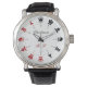 An elegant and simple chess inspired watch featuring red and black graphic chess pieces with hour and minute indicators on a clean white background. The customizable text makes this time piece a great personalized gift idea for the chess playing enthusiast.