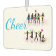 Air freshner shown with a cheerleading print on the front and cheerleader text on the back.