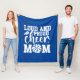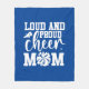 Fleece blanket is shown in a colour of royal blue with a white cheer mom pom print.