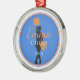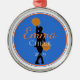 This ornament has a black shadow of a cheerleader with Orange pompoms. Sample text of Emma, Cheer and your choice of date. Colours shown are Blue, Orange, White and Black..