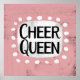 "Cheer Queen" is a cute text design in pink with black text, along with a white accent shape and white textured whimsical dots surrounding it.