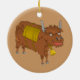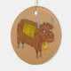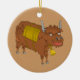 A cheerful yak with a heavy load. This is a cartoon style picture of a brown, wooly, Yak, he has a bag strapped to his bag with yellow rope. He is smiling happily.