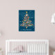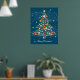 Cheerful multicolored Christmas pattern shaped like a Christmas tree with Santa, reindeers, elves, snowman, polar bear, presents, red and green bows, decorations, candy canes, red socks, etc.