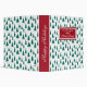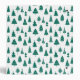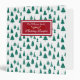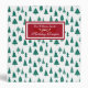 Hand drawn various green Christmas trees in a seamless pattern on a white background with classical red bracket with family name and title in decorative font with christmas border.