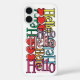 A whimsical colourful phone casemate featuring the word "Hello" repeated in various colours with an offset black outline. Accented with red hearts.