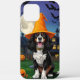 Cheerful dog wearing a bright orange witch's hat, set against a spooky Halloween backdrop. The dog, likely a spaniel breed, has a shiny black and white coat and a big, happy smile. Behind the dog, a full moon illuminates a darkened sky filled with flying bats.