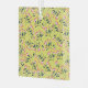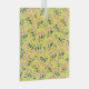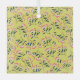 Patterned design with pink flowers and dark green leaves scattered on a bright yellow background. The floral motif is cheerful and lively.