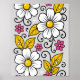 The design contains large white flowers with rounded petals and bright yellow circular centers. Each flower is outlined with thick black lines that give it a clear and bold appearance. The petals include fine black strokes that add simple detailing and texture. The design also includes smaller pink flowers with smooth rounded petals and tiny circular centers. Yellow leaves with visible black vein lines are placed among the flowers, adding contrast and warmth. Flowing black curved lines and decorative swirls connect the floral elements, creating a sense of movement and rhythm. The background is light gray, which enhances the brightness of the white petals, pink blossoms, and yellow leaves. Small star-like sparkles in white are also included, adding a soft decorative touch.
