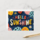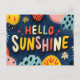 This vibrant and playful image features the phrase "HELLO SUNSHINE" in a hand-drawn, multi-colored font. The typography is set against a dark blue background filled with a variety of brightly colored abstract shapes and patterns. The overall design has a textured, artistic feel that combines bold colors and whimsical doodles to create a cheerful and positive greeting.