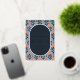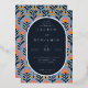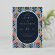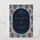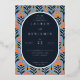 This wedding invitation features a modern and elegant design with a navy blue background adorned by a vibrant floral pattern in shades of coral, peach, and yellow. The layout is balanced and symmetrical, with an oval central text area framed by the playful floral motifs. Crisp serif typography adds a formal touch to the customizable placeholders for names, dates, and locations, while the cheerful colour palette creates a lively and inviting atmosphere perfect for celebrating love and unity.