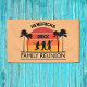 Announcement prop for a fun family reunion with family name and year of event, which needs to be personalized. Retro style with sunset, palm tree element, cheerful, jumping children.