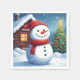 A festive snowman adorned with a red hat and scarf, standing next to a beautifully decorated Christmas tree during a snowy winter evening near a charming wooden cabin.